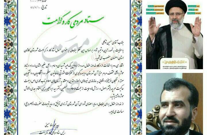 در بخشی از  این حکم آمده است با عنایت به تعهد، تدین و تجربه ی شما جنابعالی به عنوان مسوول ستاد کار و کرامت شهرستان کاشان استان اصفهان منصوب می شوید. تا، با بهره گیری از نظرات مشورتی روحانیون معظم و دانشگاهیان و دانشجویان معزز و نخبگان فرهیخته و انقلابی به سامان دهی نیروهای دلسوز، متدین و حمایت از حجت الاسلام والمسلمین دکتر سید ابراهیم رییسی اهتمام جدی و تلاش موثر داشته باشید
