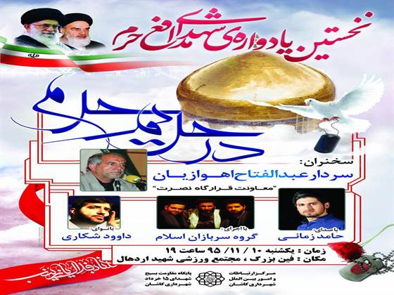 به گزارش پایگاه خبری تحلیلی عصر کاشان به نقل از مرکز ارتباطات و امور بین الملل شهرداری کاشان، مهدی نادعلی با بیان اینکه نخستین یادواره شهدای مدافع حرم شامگاه یکشنبه دهم بهمن ماه در مجتمع ورزشی شهید اردهال با سخنراني سردار عبدالفتاح اهوازیان، معاونت قرارگاه نصرت برگزار میشود، اظهار کرد: این برنامه با اجرای زنده حامد زمانی و مداحی داود شکاری و با اجراي گروه سربازان اسلام خواهد بود .
