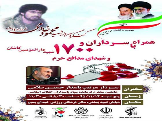 مديرمرکز ارتباطات و امور بين الملل شهرداري کاشان خاطر نشان کرد: کنگره سردارشهيد محمود خادمي همراه با سرداران و 1700 شهيد ديار دارالمومنين کاشان و شهداي مدافع حرم پنج شنبه 14 بهمن ماه ساعت 8:30 الي 11:30 با سخنراني سرتيپ پاسدارحسين سلامي، جانشين محترم فرمانده سپاه پاسداران در خيابان شهيد بهشتي، سالن فرهنگي ورزشي شهداي بسيج برگزارخواهد شد.