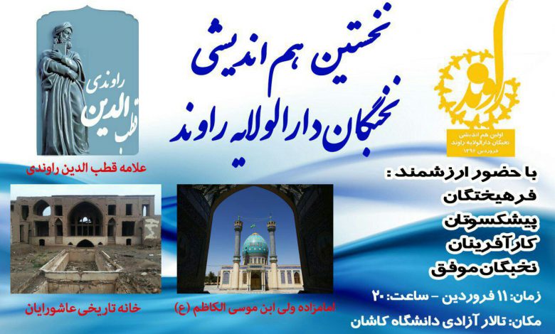 نخستین هم اندیشی نخبگان دارالولایه راوند ، مورخه فردا جمعه 96.1.11 ساعت 20 در محل دانشگاه کاشان تالار آزادی برگزار می شود